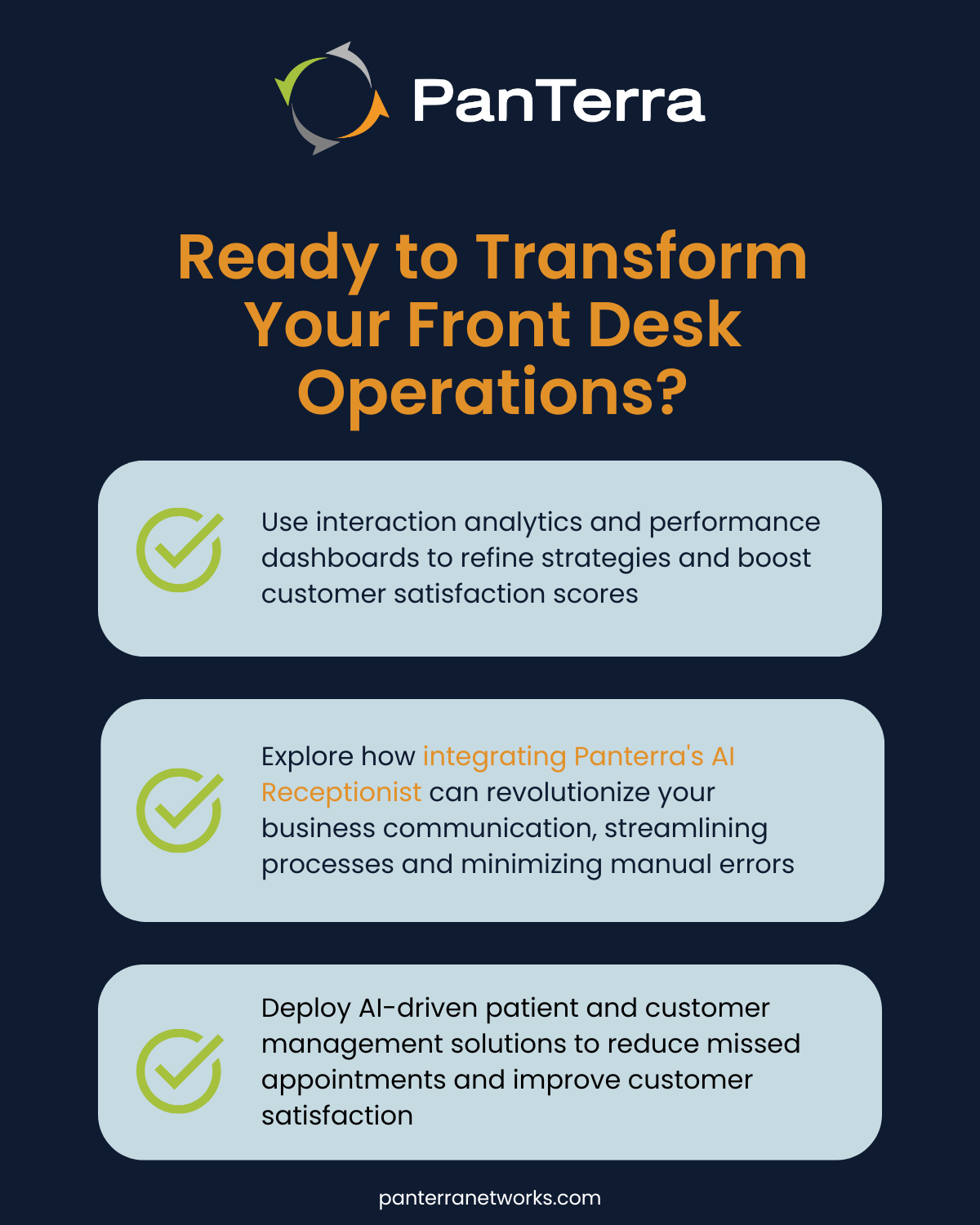 The best part? You don’t need a huge IT team to get started. With platforms like PanTerra’s AI Contact Center, small and midsize businesses can deploy AI phone answering services with ease, customized to your brand voice, integrated with your tools, and scalable for your growth.